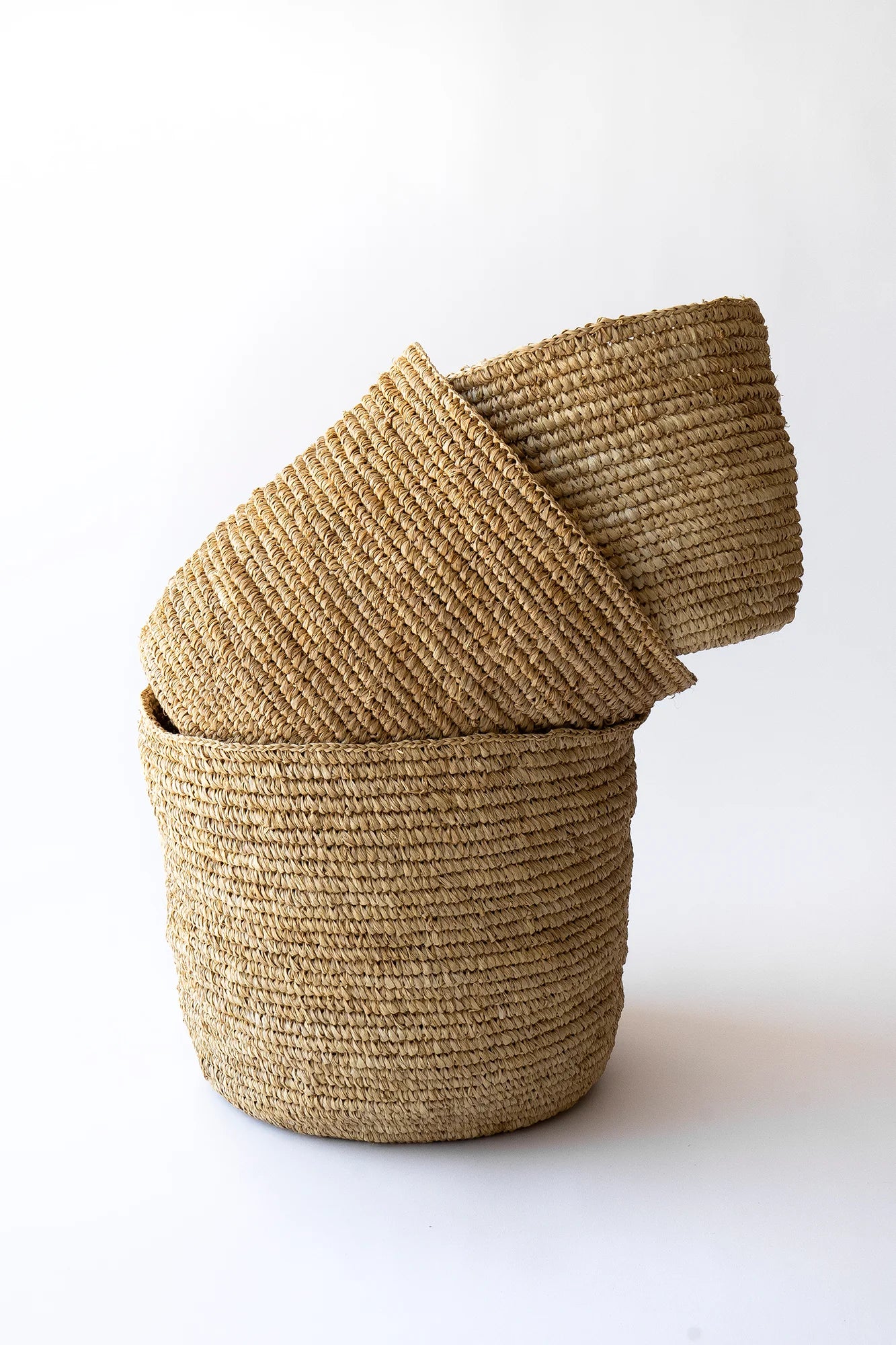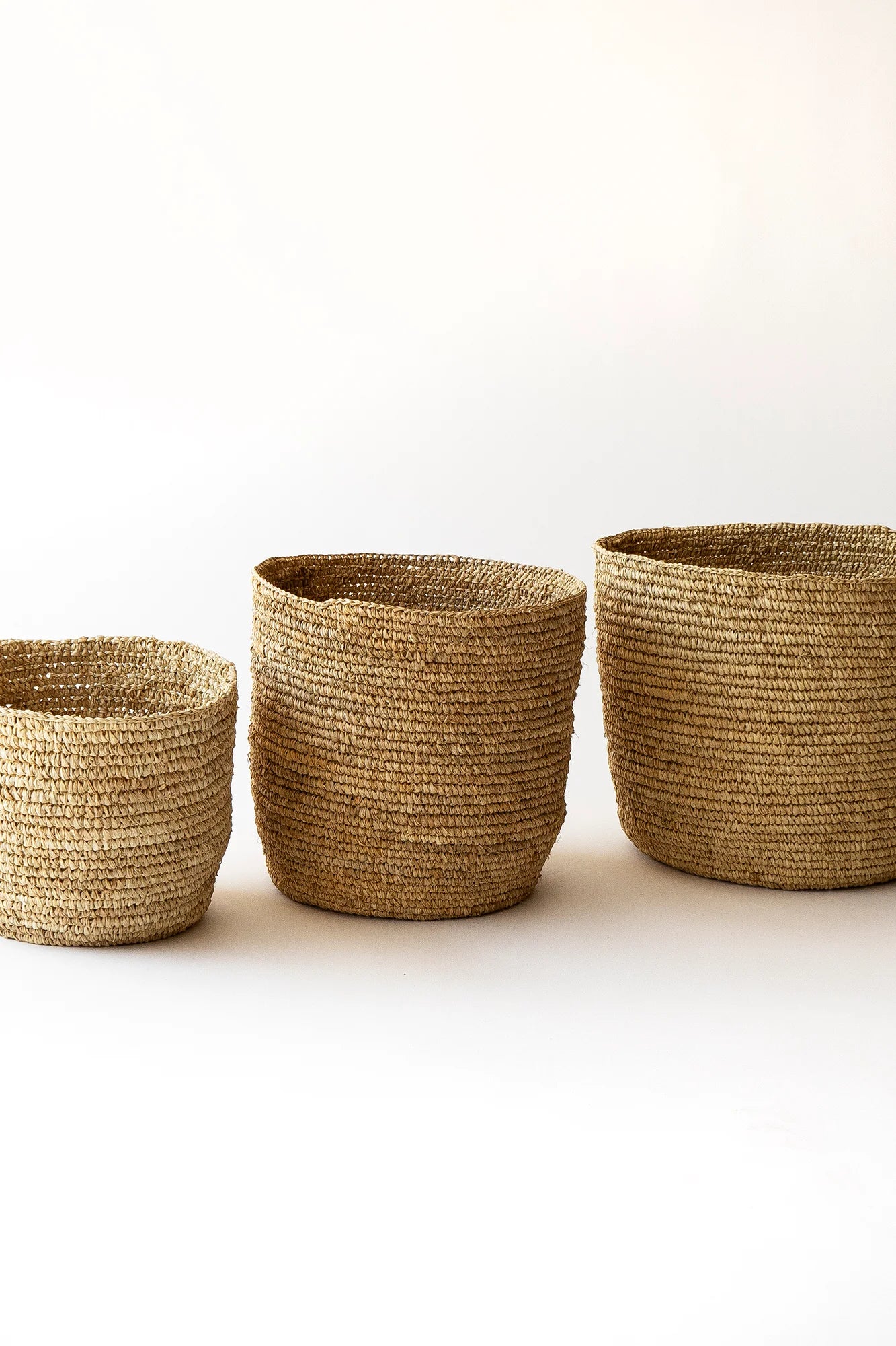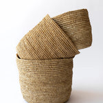 Trío de canastos en rafia natural sin asas, extraída de palmeras del género Raphia. Material versátil y resistente, perfecto para múltiples funciones: almacenamiento de juguetes, macetero o decoración. Su flexibilidad garantiza durabilidad prolongada.