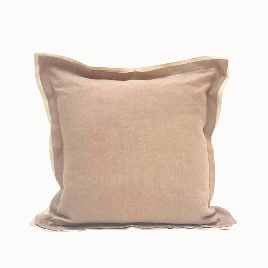 Funda de cojín reversible confeccionada en lino. Presenta dos caras diferenciadas: una en tonalidad rosa viejo y la otra en el color natural del lino, permitiendo versatilidad decorativa según tus necesidades. Destaca por su confección con una generosa pestaña bicolor que añade elegancia y define el perímetro de la pieza.