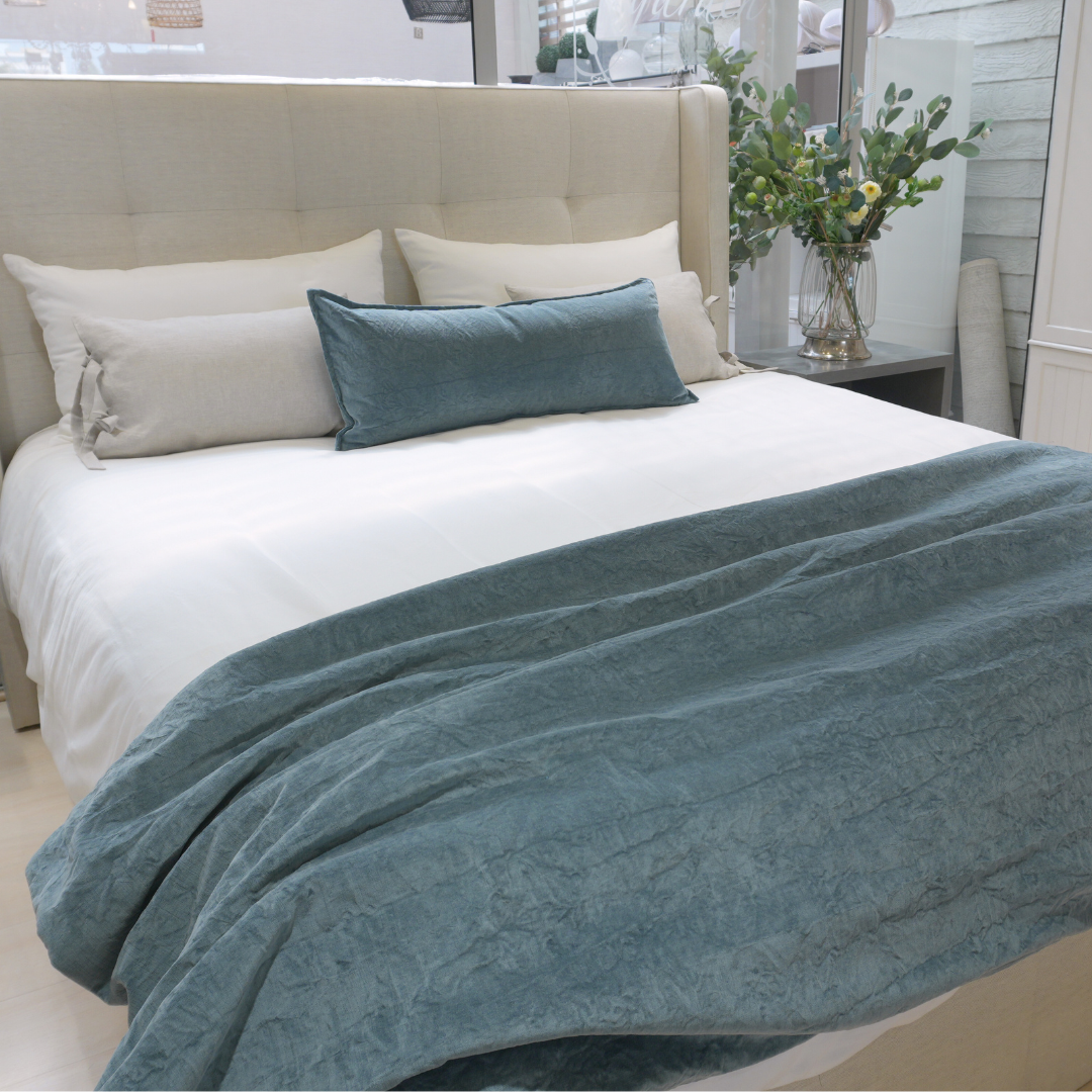 La Piecera Acolchada Terciopelo Abelia Denim destaca por su elegante textura de terciopelo inglés craquelado en tono jeans.