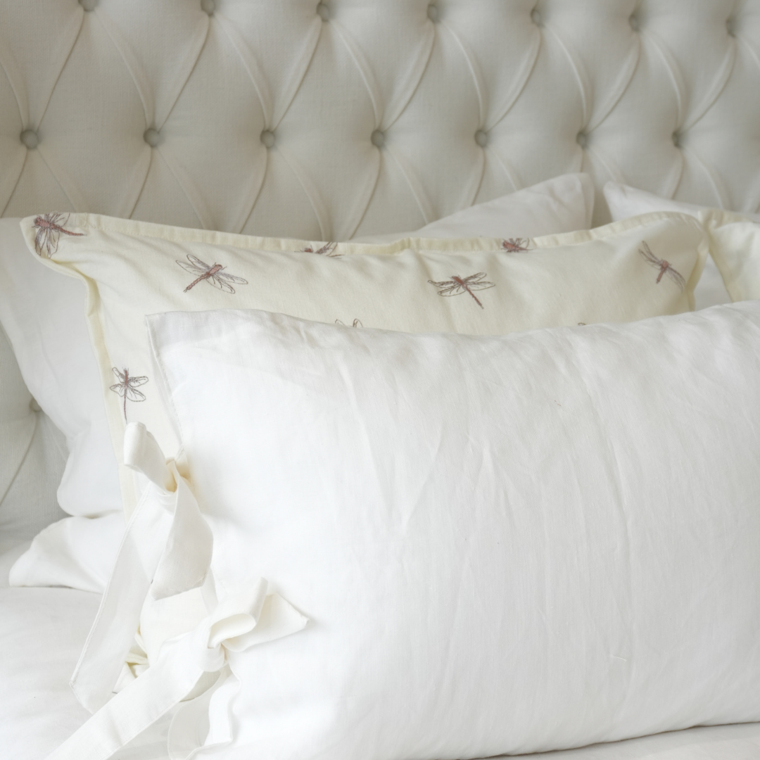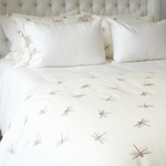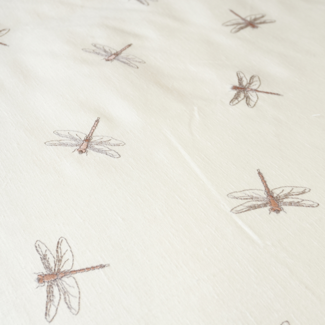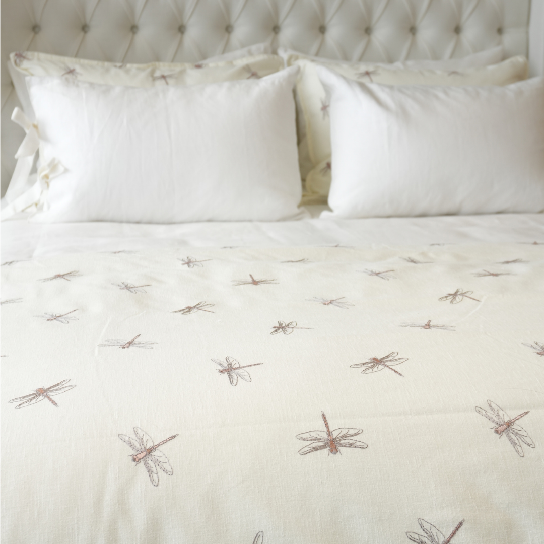 Confeccionado con algodón bordado con delicadas libélulas. Su textura y formas aporta un aire relajado a la cama, mientras que su calidad natural garantiza durabilidad y confort con el paso del tiempo.