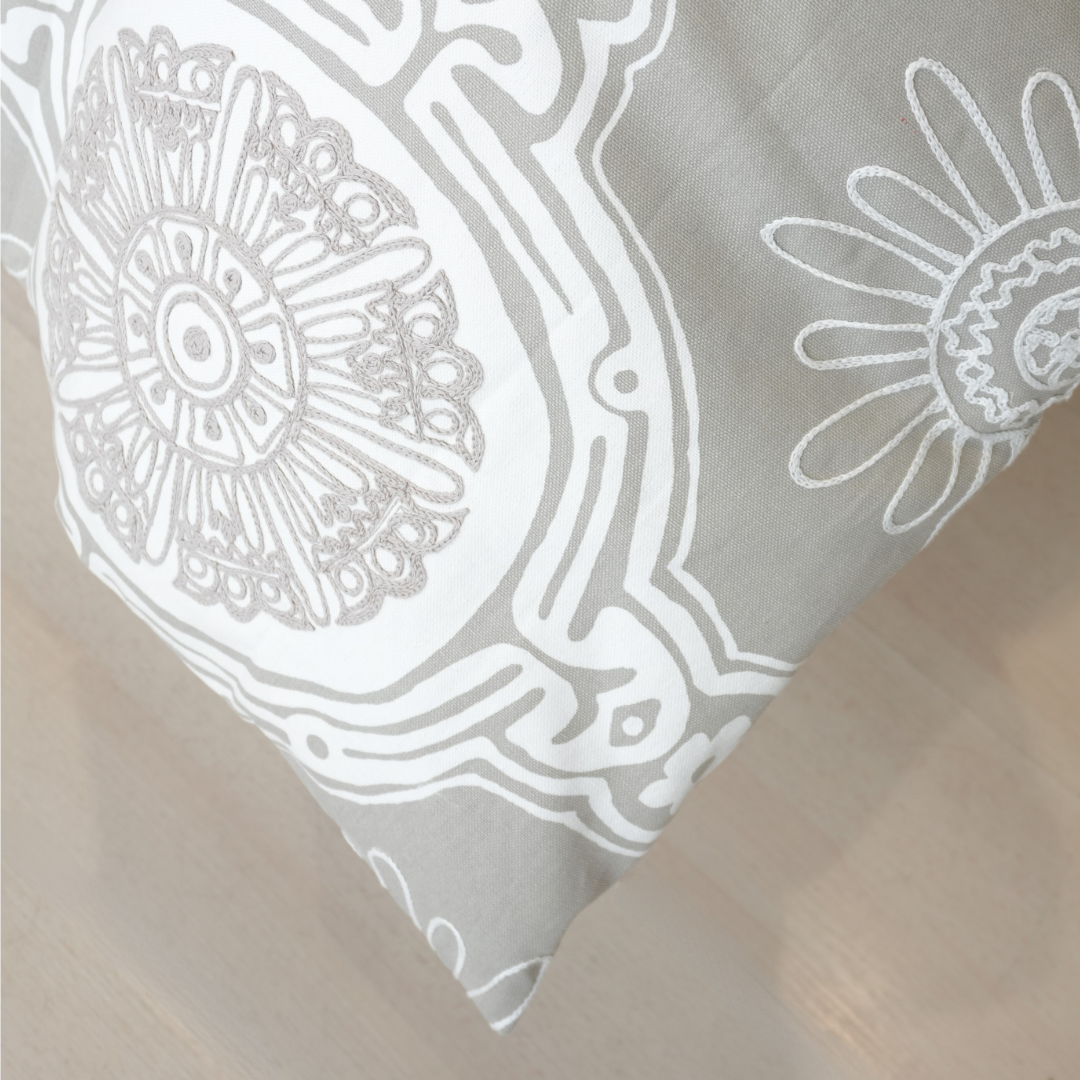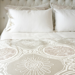 Confeccionado con algodón bordado estilo geométrico. Su textura y formas aporta un aire relajado a la cama, mientras que su calidad natural garantiza durabilidad y confort con el paso del tiempo.