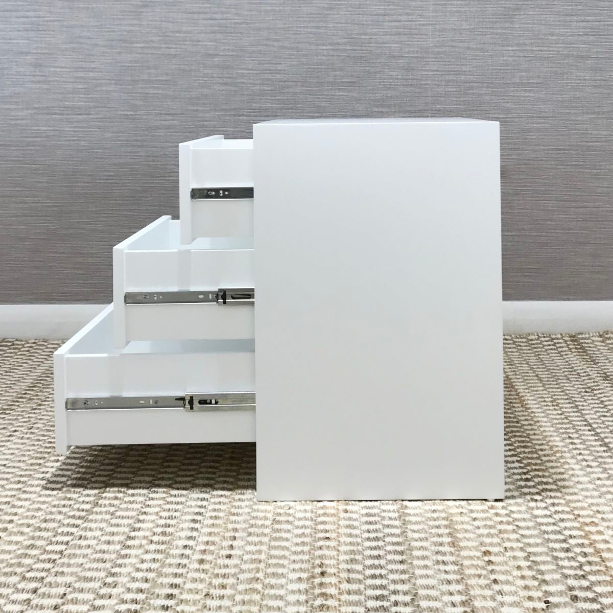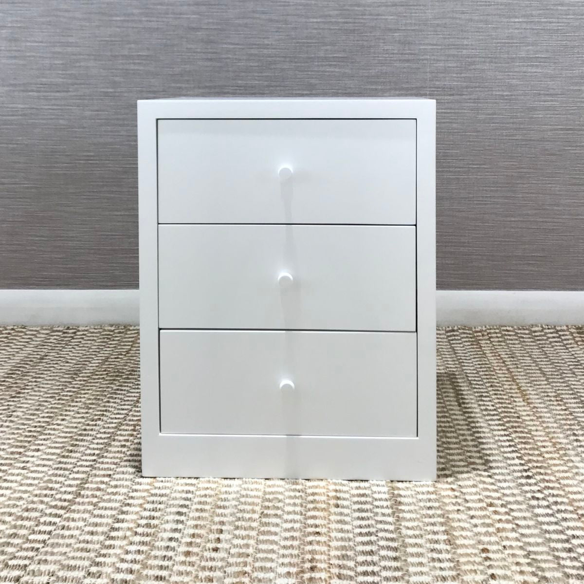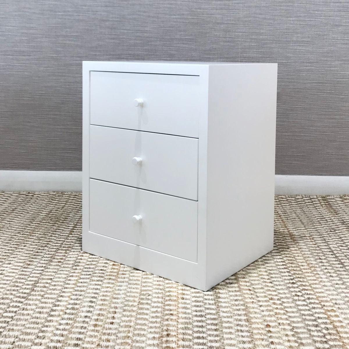 Velador Audi, con medidas de 50 x 42 x 65 cm de altura, está elaborado en HDF y presenta un acabado lacado en blanco. Dispone de tres cajones, ofreciendo almacenamiento funcional y adecuado para dormitorios infantiles.